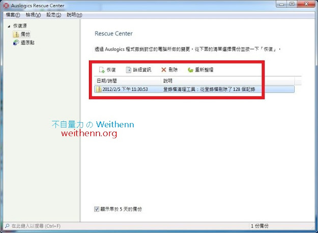 因為機碼的穩定與否與 Windows 作業系統運作息息相關,因此預設的情況下在進行垃圾機碼清除動作「以前」,Auslogics Registry Cleaner 便會自動先將目前的機碼狀態儲存下來,以便若有發生誤判的情況而清除機碼項目導致作業系統運作不穩定時便可以進行回復作業,您可以於清理動作執行後按下工作列上的「檔案 > 援助中心」 來查看機碼備份資訊,如圖 11 所示您可以看到簡略的機碼備份資訊,您可以按下「恢復」鍵來還原剛才所誤判而清理的機碼,或者按下「刪除」鍵來移除此機碼備份項目,或按下「詳細資訊」查看詳細的備份資訊內容如圖 12 所示。
