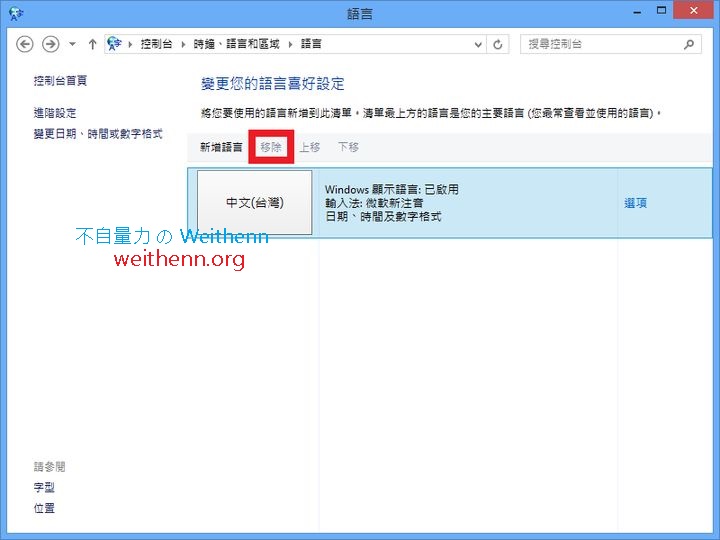圖 2、語言設定視窗時發現並無法刪除預設的新注音輸入法