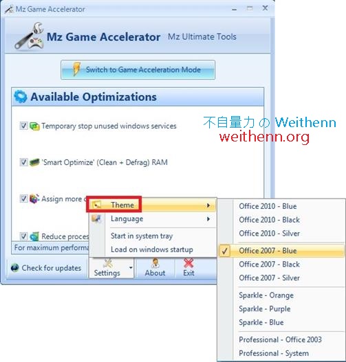 Mz Game Accelerator 智慧型的一鍵式設計讓您不需要煩人的調整程序即可達成,預設情況下會勾選所有可以優化的方式也就是 暫時停止不必要的系統服務 (Temporary stop unused windows services)、智慧型優化記憶體 (Smart Optimize RAM)、指派較多 CPU 資源給遊戲 (Assign more cpu power to the game)、減少其它應用程式的 CPU 資源 (Reduce processor usage, for other applications),接著只要按下「Switch to Game Acceleration Mode」鍵即可進入一鍵遊戲最佳化模式 (如圖 4 所示)。