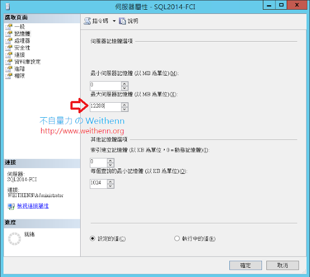 開啟 SSMS 管理工具,並採用 SQL FCI 叢集名稱「SQL2014-FCI」來登入。登入後,先將預設的 sa 改名為「sqladmin」,保持基本的安全性。因為此實作環境中 SQL01 主機的記憶體為 16GB,所以將最大伺服器記憶體設定為 12GB,以免影響 Windows 系統運作。